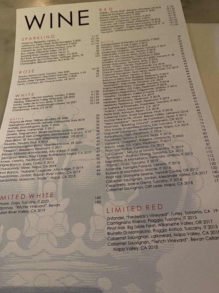 Spaghetti cooked in red wine, tossed with butter, garlic, and Grana Padano. Finished with toasted pine nuts and parsley. Not available gluten free